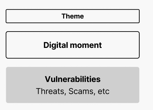 This meant digital moments alone were not enough. To make the map useful for identifying opportunities, we also needed to understand where people are actually at risk within each moment.This helped us extend the foundation to digital moments with potential vulnerabilities.