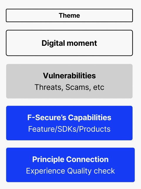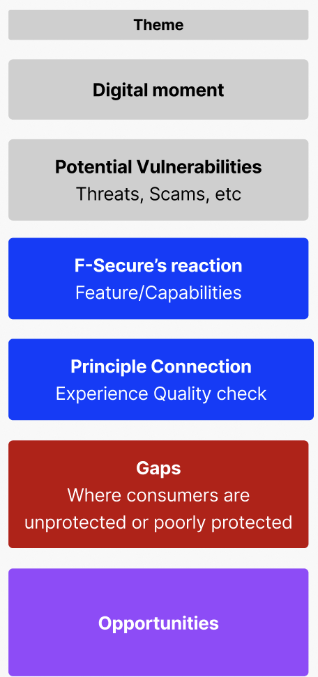 It’s an evidence-based and experience-focused system that help us identify the gap in protection that F-Secure provides for its consumers in their day to day life and digital moments. The map functions as a strategic lens to identify product opportunities associated with the existing protection gaps.