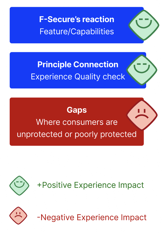 • Principle Gaps: A principle gap exists when technical protection is in place, but the overall security experience fails to reflect F-Secure’s Security Experience Principles. Here, the issue is not the absence of protection, but how it is delivered. The experience may feel unclear, stressful, intrusive, or disconnected from the consumer’s needs in that moment.