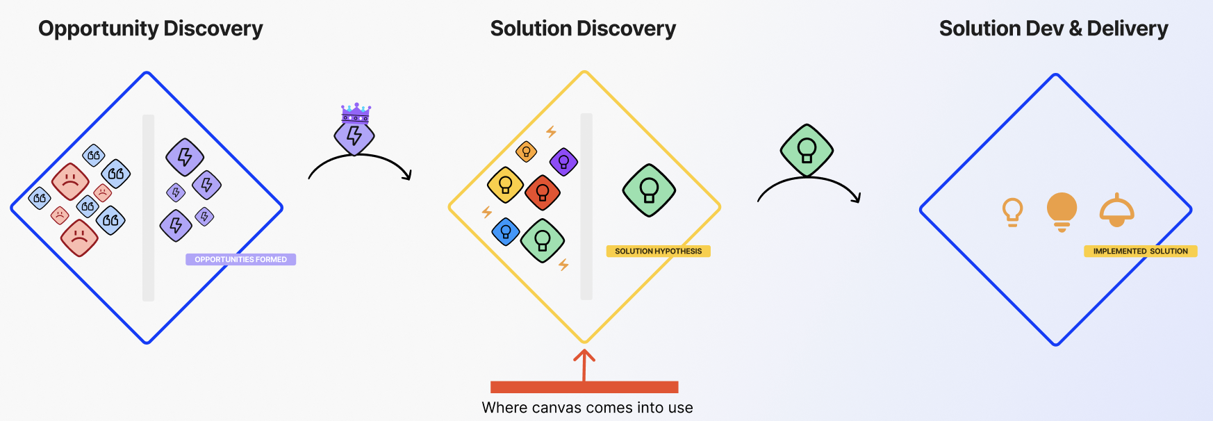 The Canvas was primarily applied and evaluated in Diamond 2, but its design was informed by insights from Diamond 1 and extended to support the transition into Diamond 3 partially. The goal was to create a tool that brings clarity, structure, and cross-functional alignment to early solution definition, especially in F-Secure’s complex B2B2C setting.