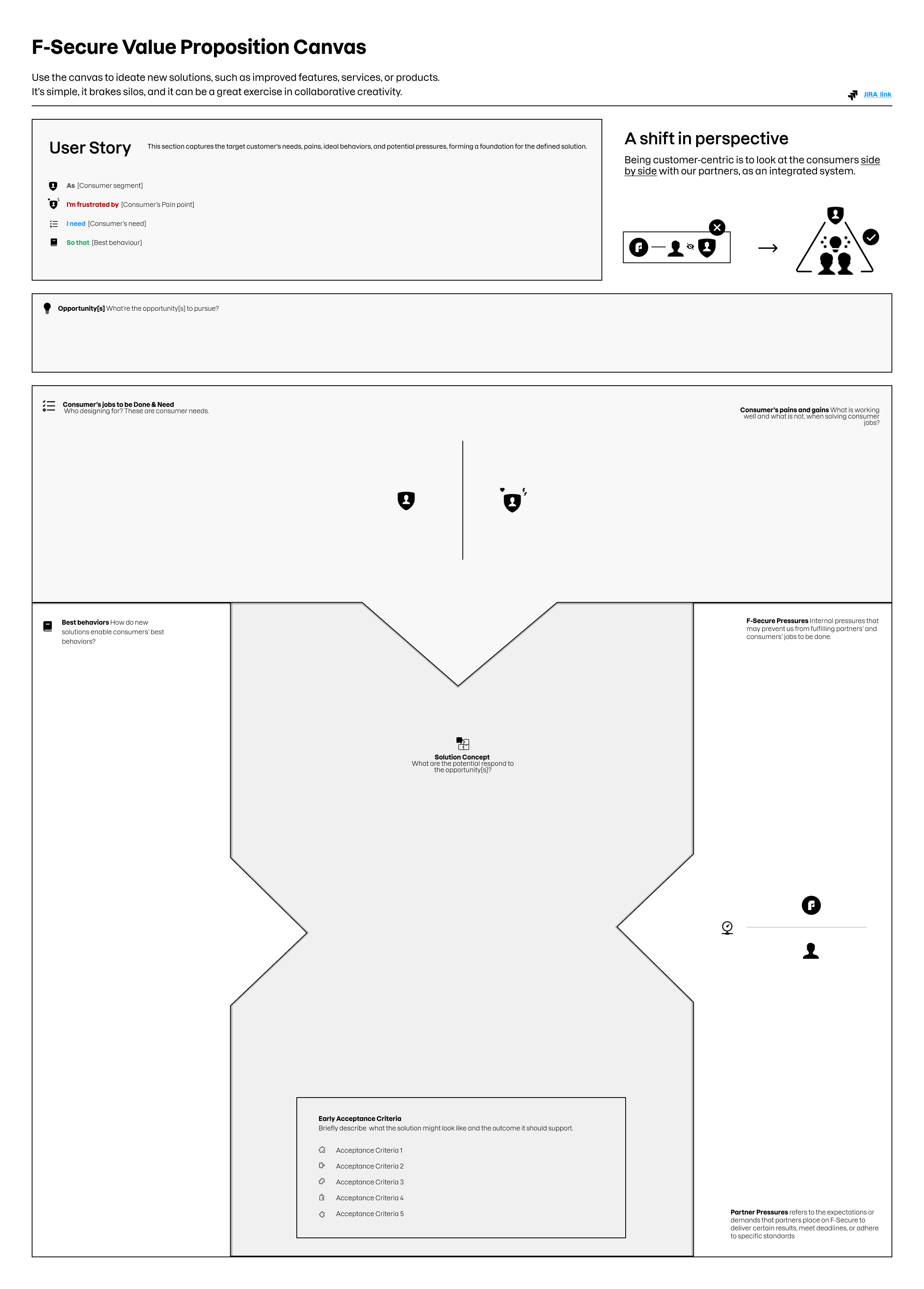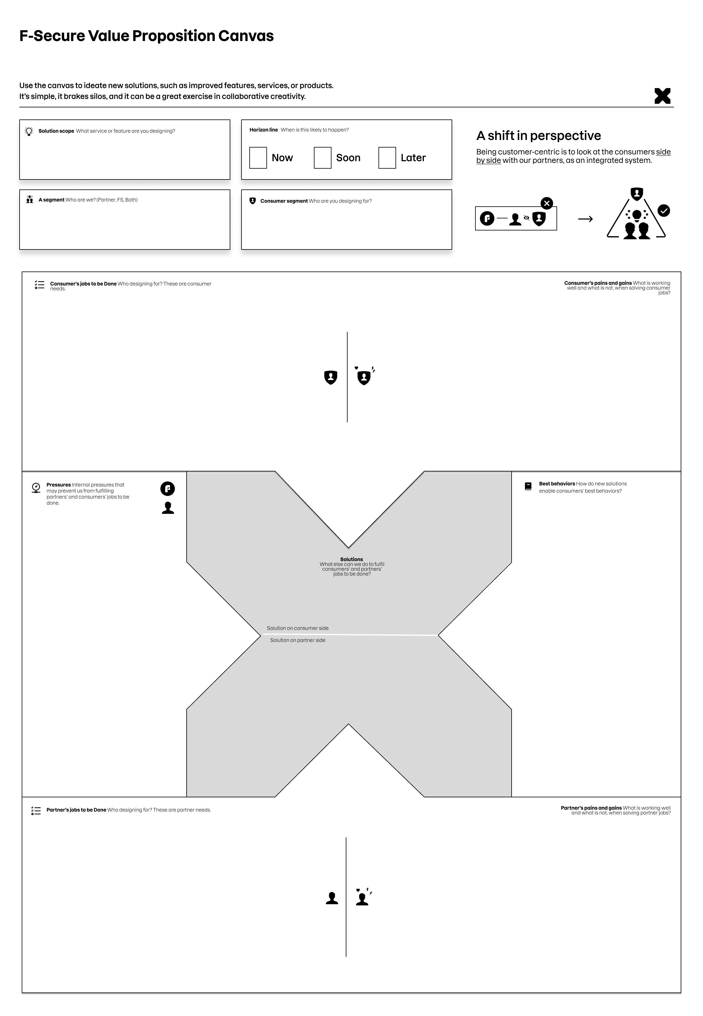 The approach was reflective and iterative, grounded in cross-functional collaboration and aligned with F-Secure’s ongoing adoption of the Triple Diamond process as a customer-centric design framework. Rather than applying a theoretical model in isolation, the Canvas was designed to support that transition by helping teams in several key ways: